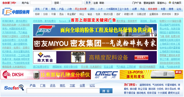 包含中國(guó)粉體網(wǎng)首頁(yè)個(gè)性關(guān)鍵詞服務(wù)、中國(guó)粉體搜索搜索關(guān)鍵詞排名服務(wù),給企業(yè)創(chuàng)造更多被潛在客戶找到的機(jī)會(huì)。另外,關(guān)鍵詞推廣相對(duì)翻牌廣告費(fèi)用較低,是相關(guān)企業(yè)宣傳推廣自己的產(chǎn)品、提高企業(yè)知名度的一種非常行之有效的方法。